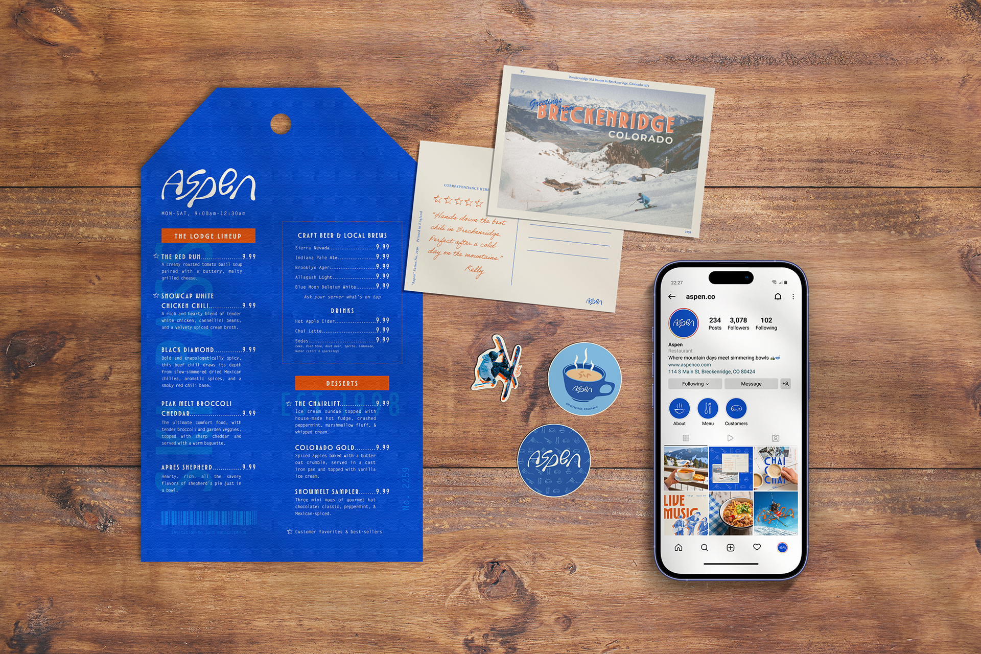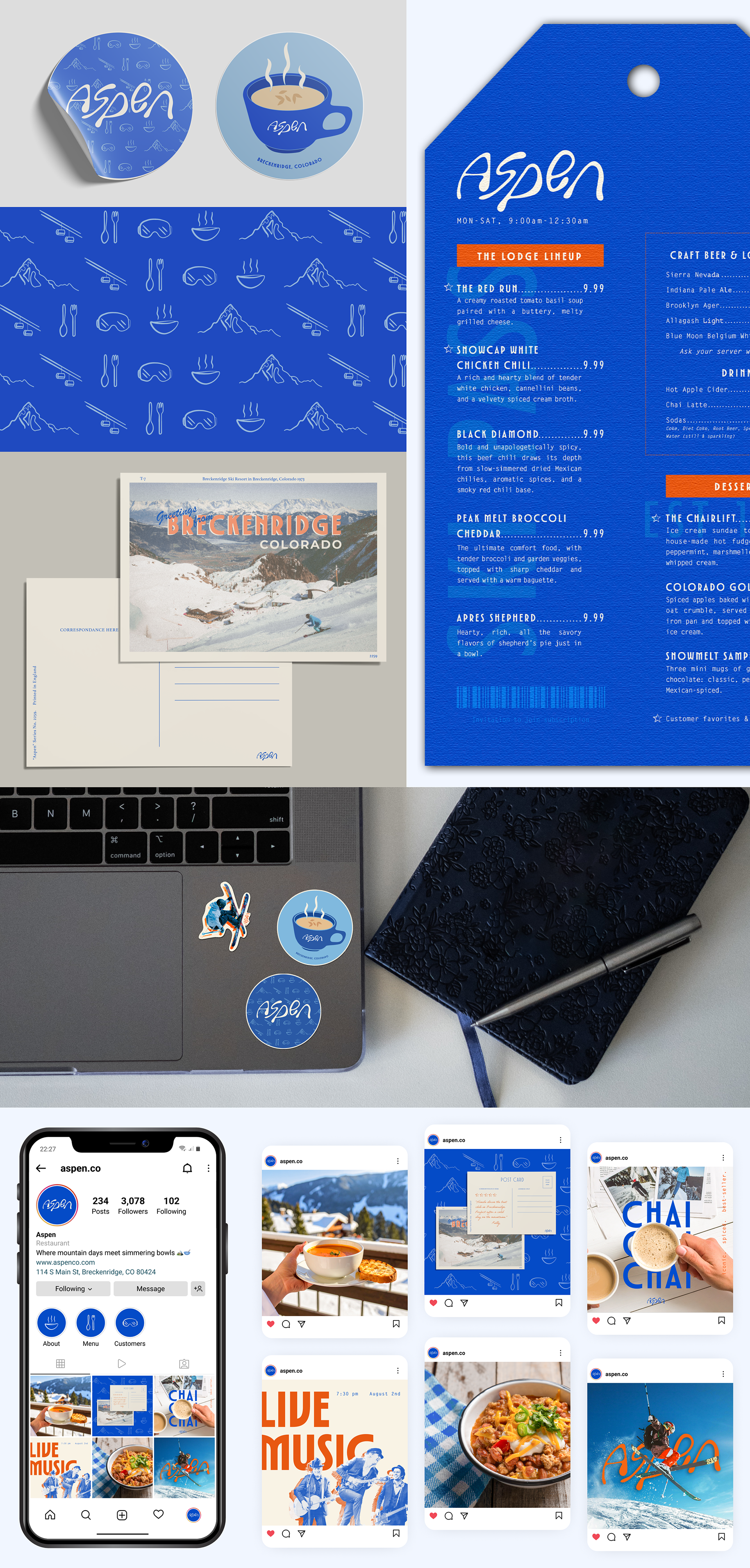 Aspen is a cozy soups and chili restaurant located in the heart of Breckenridge, Colorado on Main St. right down the road from Breckenridge Ski Resort. At Aspen, you can find community, be in a welcoming environment, and experience local roots. It's open late to serve those who just finished their last ski down the Colorado mountains and need a delicious pick-me-up. For this restaurant, I created a menu, a postcard, stickers, and their social media feed.