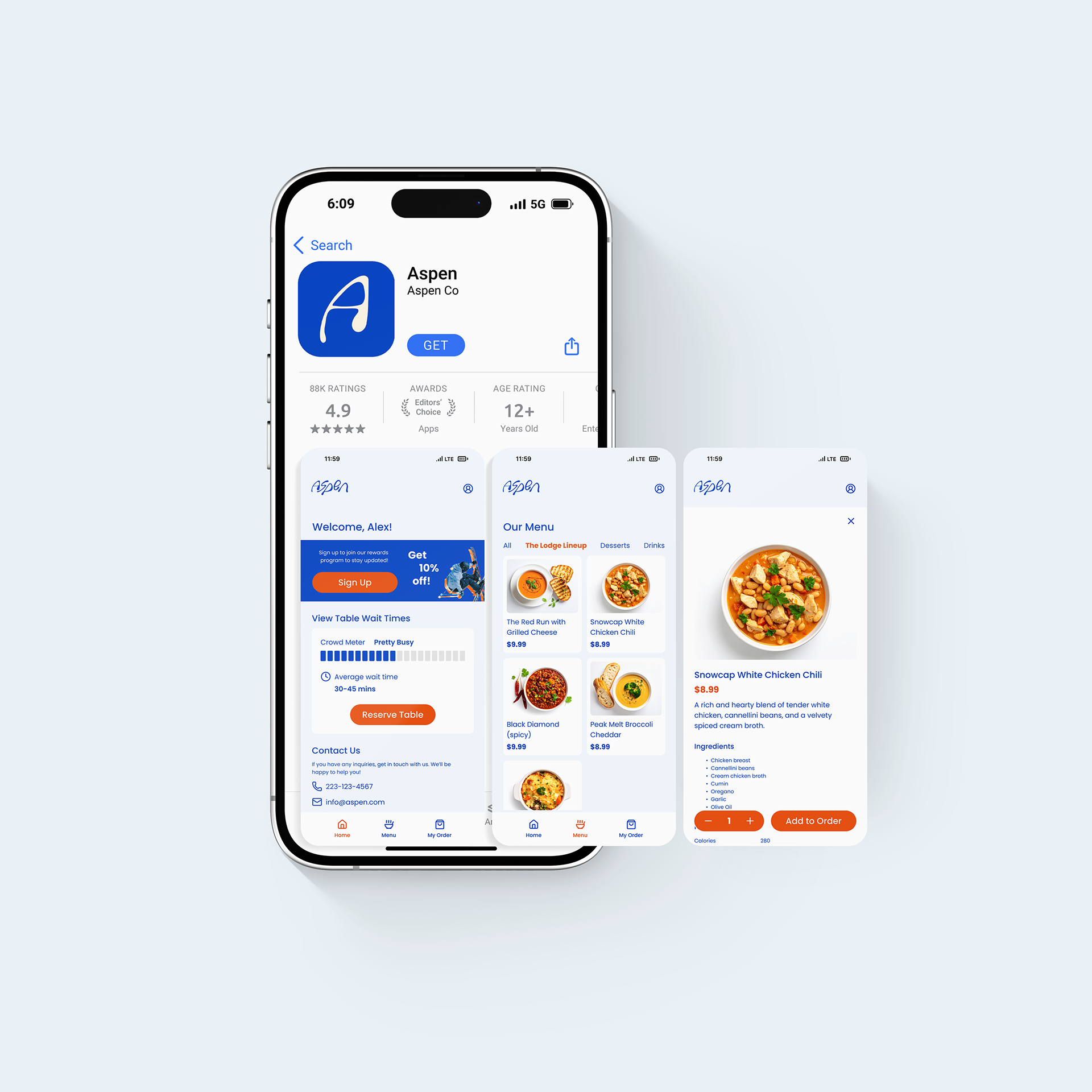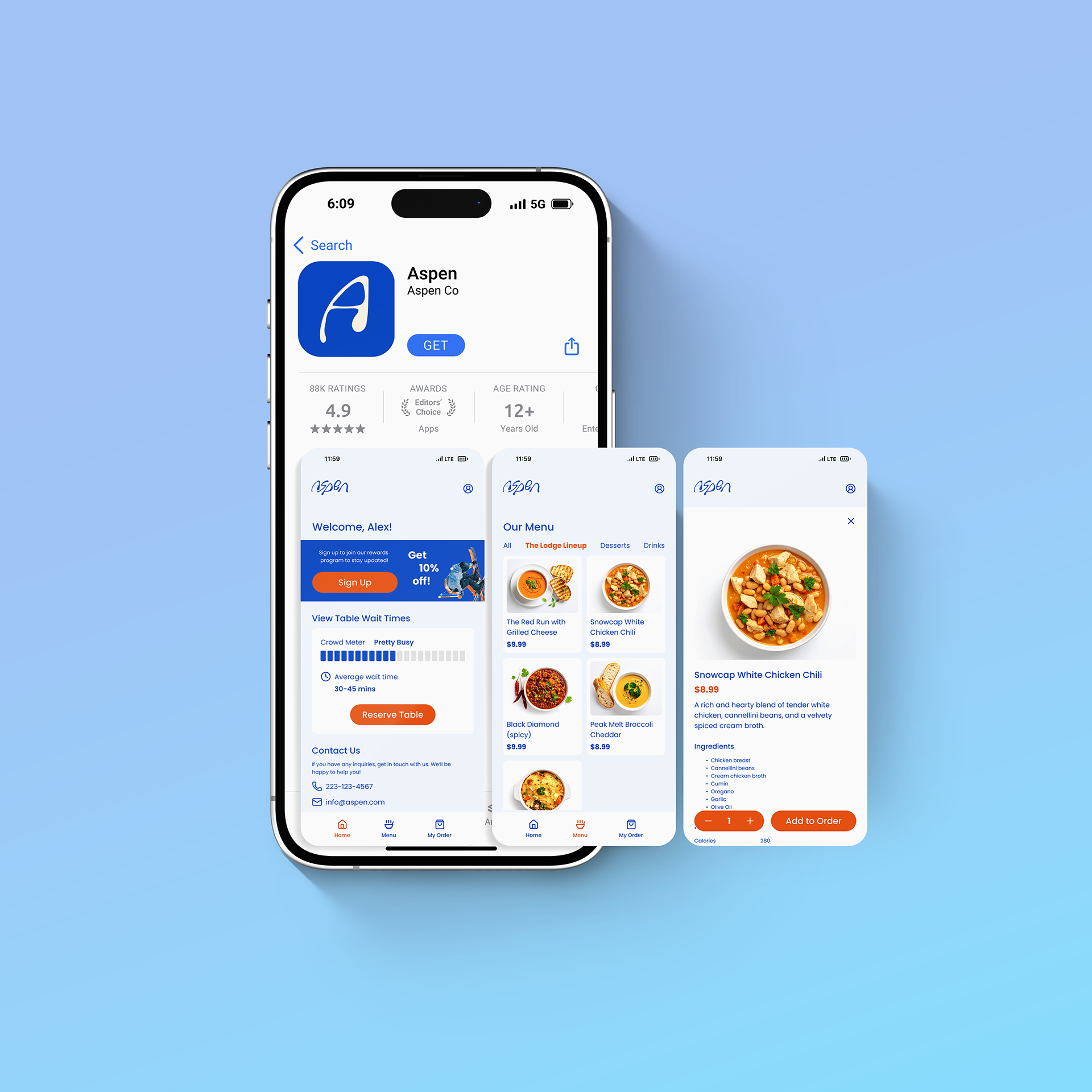 Located on Main St. in Breckenridge, Colorado, Aspen is a soups and chili restaurant. It's perfect for a cold day on the slopes. The app streamlines the ordering process for skiers and resort visitors, allowing them to browse the menu, place orders ahead of time, and view real-time wait statuses. The app prioritizes simplicity and accessability for those who are ready to eat a warm meal after hitting the slopes all day.