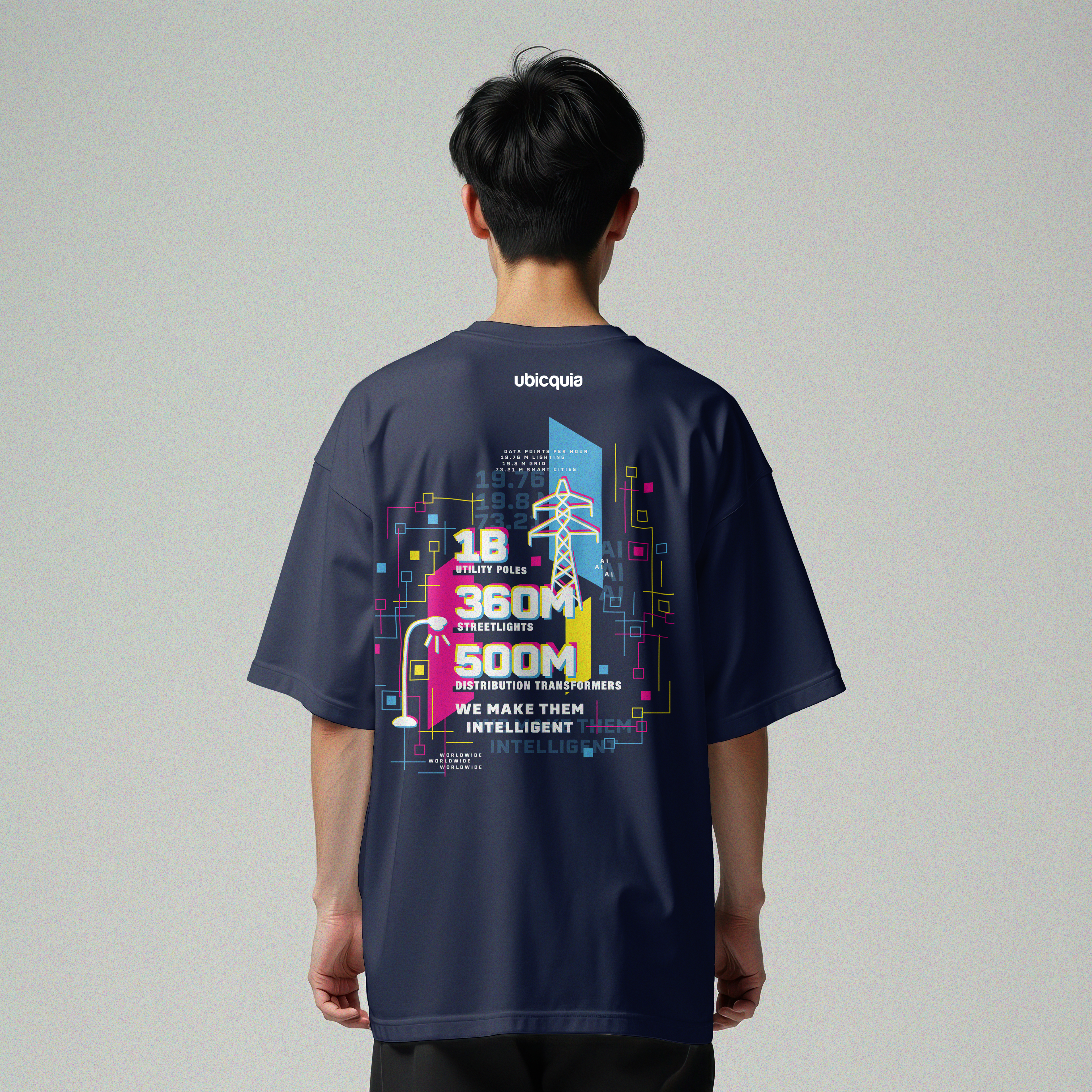 After many revisions and exploration, it was decided that adding colors would better the chances of winning the most colorful t-shirt for the contest. The reasoning for the numbers and graphics in the design is to best describe what the company does. The lines and squares represent datapoints and the graphics include a utility pole and a streetlight as those are technologies that the company sells smart technology for.